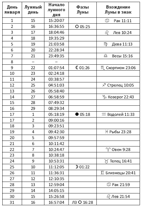 14 (с 22:43), 15, 16, 17 (до 11:33) января Луна в Козероге. 17 января – Новолуние (5:18).