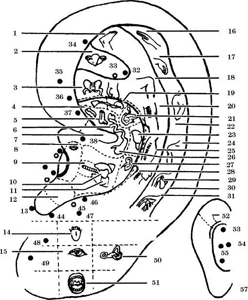 1 – пальцы стопы; голеностопная область; 2- матка; 3 – седалищный нерв; 4 – толстая кишка; 5 – аппендикс; 6 – тонкая кишка; 7 – диафрагма; 8 – рот; 9 – трахея; 10 – сердце; 11 – легкие; 12 – три части туловища; 13 – зрение I;14 – язык; 15 – глаза; 16- пальцы кисти; 17 – запястье; 18 – колено; 19 – почка; 20 – живот; 21 – поджелудочная железа; 22 – локоть; 23 – печень; 24 – плечо; 25 – область груди; 26 – желудок; 27 – селезенка; 28 – шейный отдел позвоночника; 29 – плечевой сустав; 30 – лопатка; 31 – шея; 32 – точка тхан-мон; 33 – ягодица; 34 – геморрой; 35 – наружные половые органы; 36 – мочеточник; 37 – нижняя часть прямой кишки; 38 – пищевод; 39 – вершина козелка; 40 – горло, 41 – нос; 42 – надпочечник; 43 – носовая полость; 44 – зрение П. 45 – яичко; 46 – регулирующая дыхание; 47 – лоб; 48, 49 – точки анальгезии; 48 – обезболивание приудалении верхних зубов; 49 – обезболивание три удалении нижних зубов; 50 – внутреннее ухо; 51 – миндалины; 52 – гипотензивная канавка; 53 – головная боль; 54 – почки; 55 – сердце; 56 – нижняя конечность; 57 – задняя поверхность ушной раковины.
