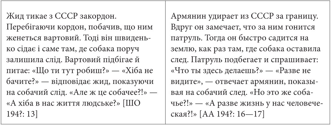 В первую очередь стоит упомянуть сборник «Советские анекдоты» [ШО 194?], составленный неким О. Шило – он представляет собой небольшую брошюру на украинском языке без указания даты и места издания133. Судя по всему, она была подготовлена и издана кем-то из украинской эмиграции второй волны уже после Потсдамской конференции (июль – август 1945 года)134. Позже большая (89 из 93 анекдотов) часть текстов из собрания Шила была переведена на русский язык135, лишена украинской специфики (к примеру, упоминаний про Т. Шевченко – последний традиционно в анекдотических сюжетах, кочующих из России на Украину и обратно, заменяется на А. Пушкина) и включена в изданный в Буэнос-Айресе под названием «Антисоветские анекдоты: борьба народной пропаганды с большевистской» [АА 194?] анонимный сборник анекдотов. Эти сборники чрезвычайно похожи друг на друга и не имеют конкретной датировки – и то, что сборник Шила первичен, можно утверждать лишь на основе анализа иллюстраций: совершенно очевиден факт выборочного копирования изображений из одной книги в другую. В буэнос-айресское собрание так же выборочно заимствовались тексты из немецкого агитационного издания «Как поживаете?». Безымянный составитель «Антисоветских анекдотов…» отличался одной очень характерной редакторской особенностью – он, в отличие от Ю. Музыченко, убирал персонажа-еврея из сюжетов, могущих быть воспринятыми как оскорбительные: даже традиционно «еврейские» сюжеты он переделывал под «армянские».