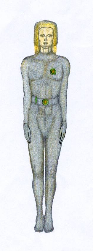 Она положила свою руку на своего рода «медальон», который, как я заметил раньше, был «прикреплён» на высоте её левой груди, и своей другой рукой она держала что-то напоминающее большую шариковую ручку, которую она отстегнула от своего пояса.