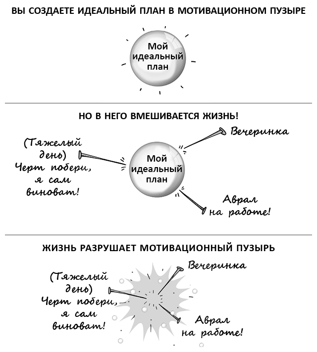 Независимо от поводов и причин, побуждающих нас предпринимать новые попытки или даже помогающих добиваться временных успехов, рано или поздно в ситуацию вмешиваются жизненные реалии! На работе возникает аврал, стареющий родитель нуждается в дополнительном уходе, дети или домашние питомцы неожиданно заболевают… Со временем наши надежды и намерения, связанные с планами питания или программами физических упражнений, неизбежно приводят к каким-нибудь конфликтам. И эти конфликты часто становятся непредвиденными загвоздками, которые пускают под откос наши грандиозные проекты и сбивают нас с пути, ведущего к преобразованиям.