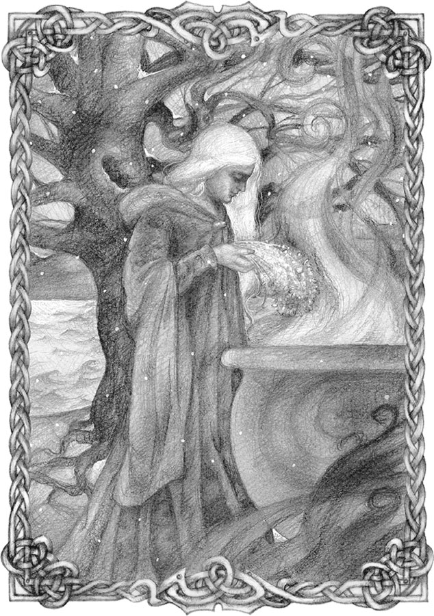 Вооружившись этим знанием, Керидвен работает без перерывов целый год, собирая травы, сверяясь с книгами и читая по звездам. Она вливает в котел воды прорицания и вдохновения, бросает туда все травы, и коренья, и океаническую пену – все в точном соответствии с движением звезд. Желая сосредоточиться на магической цели, она нанимает мальчика по имени Гвион Бах, чтобы помешивать содержимое котла, и слепого старика по имени Морда, чтобы поддерживать огонь. В течение всего года и дня сын ничем ей не помогает. И поэтому в конце он получает именно то, что заслужил за свое трудолюбие: абсолютно ничего.
