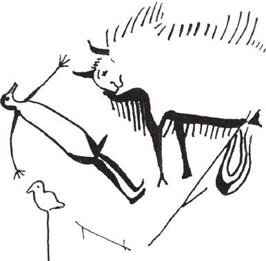 Среди очень редких изображений человека есть сцена у колодца в пещере Ласко (Рис. 1), которая заслуживает попытки объяснения со стороны представителей нейронауки. Мы видим здесь лежащего мужчину с птичьей головой и с эрекцией, раскинувшего руки перед бизоном, живот которого пронзен копьем, и из него вываливаются внутренности. Птица, сидящая на копье рядом с лежащим мужчиной, кажется, собирается взлететь. Человек как будто видит сон. Известно, что периодическое возникновение эрекции у мужчин (каждые 90 минут) во время сна совпадает с появлением сновидений. Значит, мы можем предположить, что птица представляет собой некий «дух», покидающий тело человека, чтобы отправиться в прошлое или в будущее. Этот рисунок изображает намерение (или желание) убить бизона. Понятие «души» или «духа», покидающего тело во время сновидения, по мнению этнологов, свойственно всем зарождающимся цивилизациям. Значит, можно предположить, что наши предки кроманьонцы уже подметили, что эрекция является верным соматическим признаком процесса сновидений. Но как объяснить, что это явление было переоткрыто лишь через более, чем тридцать веков[3], в 1965 году, нью-йоркским нейрофизиологом Чарльзом Фишером?