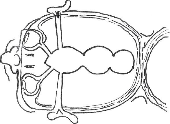 Рис. 1. – Леонардо да Винчи (живший в переходную эпоху между Средневековьем и Возрождением) сделал любопытный рисунок сангиной. Это череп в горизонтальном разрезе, вид сверху. Представлены три желудочка, соединенные между собой, но принятая в то время вентрикулярная концепция вынуждает этого замечательного исследователя и гениального рисовальщика изобразить несуществующую связь между глазами и первым желудочком посредством оптических нервов. Он нарисовал также две полоски, соединяющие с этим желудочком уши.