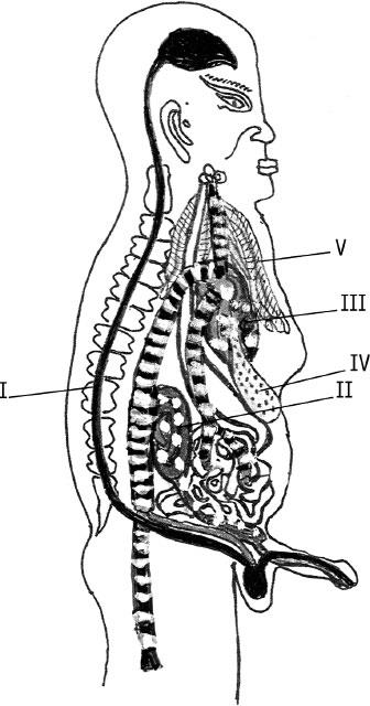 1 – Комплекс тестикул, спинного и головного мозга – «студенистый океан». II – сердце и крупные сосуды, «монарх» всего тела. III – поджелудочная железа. IV – легкие. V – (белым пунктиром) – почки и мочевыводящие пути.