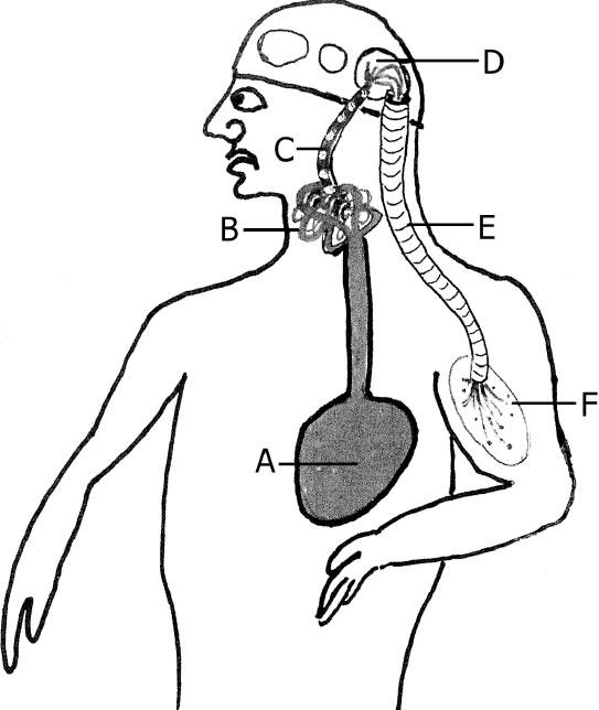 А – сердце, содержащее «жизненные духи». В – духи поступают в мозг и, проходя через «чудесную сеть» (rete mirabile), очищаются, превращаясь в «животные духи». C-D – животные духи достигают четвертого желудочка и проникают внутрь Е – полого нерва, по которому и поступают к F – мышцам.