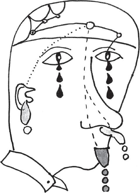 Связь между четырьмя гуморами Гиппократа, которые проистекают из желудочков и их выделений через отверстия в черепе: кровь (через рот), мокрота (через нос), ушная сера (или желтая желчь) через уши и слезы через глаза.