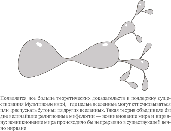 И тогда крошечный участок Вселенной может внезапно расшириться и «образовать почку», пустить побег дочерней вселенной, от которой, в свою очередь, может отпочковаться новая дочерняя вселенная; при этом процесс «почкования» продолжается беспрерывно. Представьте, что вы пускаете мыльные пузыри. Если дуть достаточно сильно, то можно увидеть, как некоторые из них делятся, образуя новые, «дочерние» пузыри. Подобным образом одни вселенные могут постоянно давать начало другим вселенным. Согласно этому сценарию, Большие взрывы происходили все время, происходят и сейчас. Если это верно, то, возможно, мы плаваем в море таких вселенных, словно пузырек, покачивающийся в океане среди других пузырьков. По сути, более подходящим словом будет не «Вселенная», а «Мультивселенная».