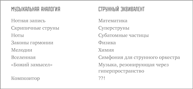 В такой терминологии законы физики, тщательно обоснованные тысячелетними экспериментами, являются не чем иным, как законами гармонии, которые справедливы для струн и мембран. Законы химии – это мелодии, которые можно сыграть на этих струнах. Вся Вселенная представляет собой божественную симфонию для «струнного оркестра». А «Божий замысел», о котором столь красноречиво говорил Эйнштейн, – это космическая музыка, резонирующая сквозь гиперпространство. (Возникает вопрос: если Вселенная – это симфония для струнного оркестра, то кто ее автор? Я вернусь к этому вопросу в главе 12.)