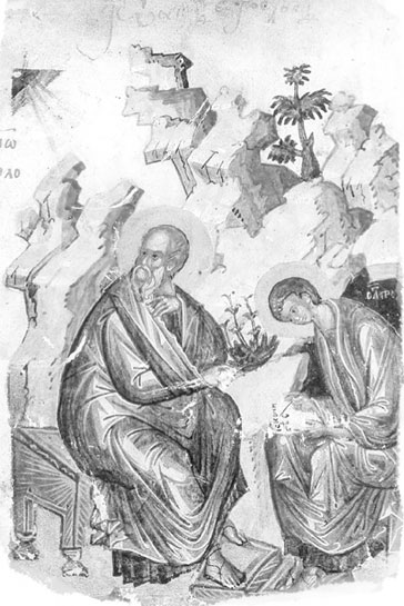 Иоанн Богослов и Прохор. Миниатюра. 1401 г.