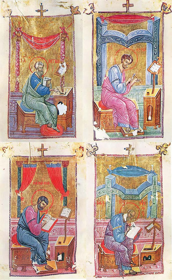 Четыре евнагелиста. Миниатюра. Четвероевангелие, Византия, XIV в.; Афон, монастырь Дионисиат