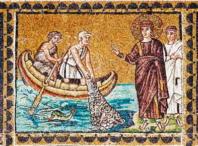 Однажды, когда народ теснился к Нему, чтобы слышать слово Божие, а Он стоял у озера Геннисаретского, увидел Он две лодки, стоящие на озере; а рыболовы, выйдя из них, вымывали сети. Войдя в одну лодку, которая была Симонова, Он просил его отплыть несколько от берега и, сев, учил народ из лодки. Когда же перестал учить, сказал Симону: отплыви на глубину и закиньте сети свои для лова. Симон сказал Ему в ответ: Наставник! мы трудились всю ночь и ничего не поймали, но по слову Твоему закину сеть. Сделав это, они поймали великое множество рыбы, и даже сеть у них прорывалась. И дали знак товарищам, находившимся на другой лодке, чтобы пришли помочь им; и пришли, и наполнили обе лодки, так что они начинали тонуть. Увидев это, Симон Пётр припал к коленям Иисуса и сказал: выйди от меня, Господи! потому что я человек грешный. Ибо ужас объял его и всех, бывших с ним, от этого лова рыб, ими пойманных; также и Иакова и Иоанна, сыновей Зеведеевых, бывших товарищами Симону. И сказал Симону Иисус: не бойся; отныне будешь ловить человеков. И, вытащив обе лодки на берег, оставили всё и последовали за Ним (Лк. 5:1-11).