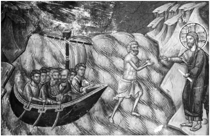 Итак, Петр вышел из лодки и пошел по воде навстречу Иисусу. Но в какой-то момент, видя сильный ветер, он испугался и начал тонуть. Причина заключалась в том, что он «усомнился». В чем? В чудотворной силе Иисуса, в Его Божественном достоинстве? Или в своей способности идти навстречу Иисусу по воде? Пока действия Петра были мотивированы верой, он бесстрашно шел по воде; как только вера в нем поколебалась, он утратил только что полученную от Иисуса способность чудесным образом преодолевать естественные законы.