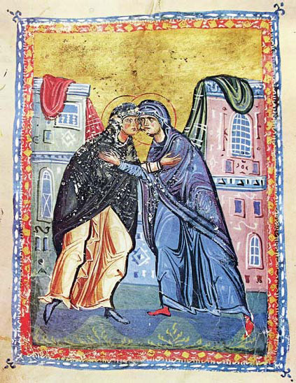 Встреча Марии и Елисаветы. Книжная миниатюра. XII в. Англия, Лондон, Британская библиотека
