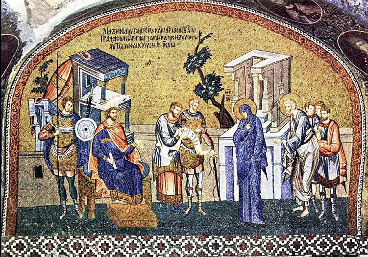 Иосиф и Мария перед писцами царя Ирода. Мозаика. Нач. XIV в. Церковь монастыря Хора (Кахрие-джами), Турция, Стамбул