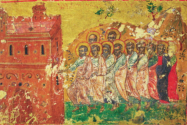 Возвращение апостолов в Иерусалим. Миниатюра из греко-грузинской рукописи. Кон. XV в. (РНБ. O. I. 58. Л. 43)