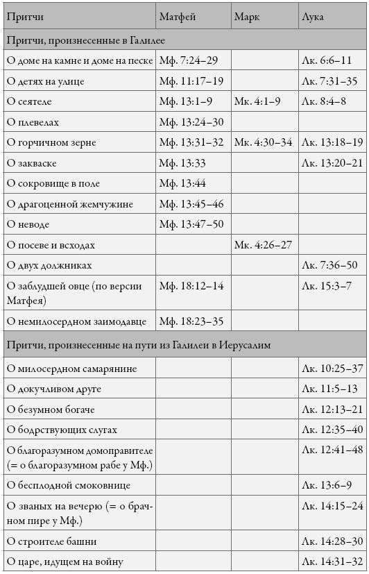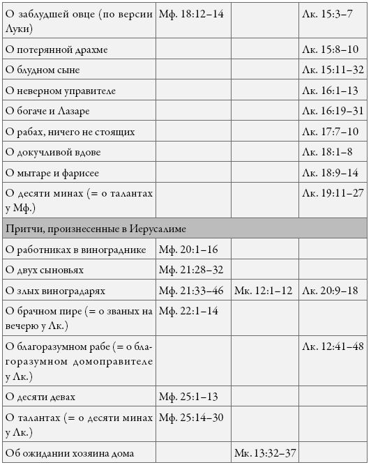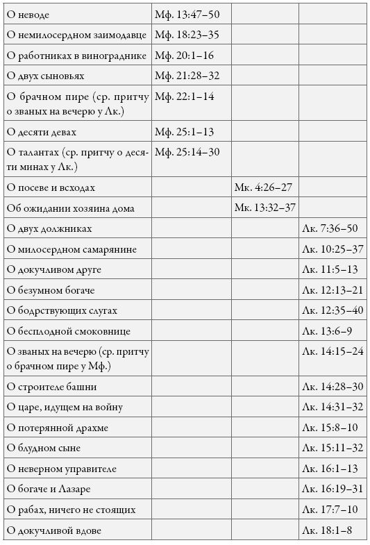 Как явствует из этой таблицы, наибольшее количество притч содержится в Евангелиях от Матфея и Луки, меньшее – в Евангелии от Марка.