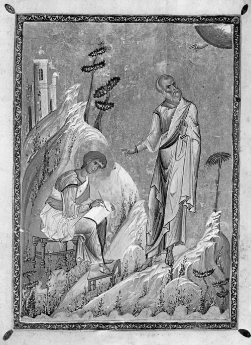 Апостол и евангелист Иоанн Богослов диктует текст Апокалипсиса. Византийская миниатюра XI века