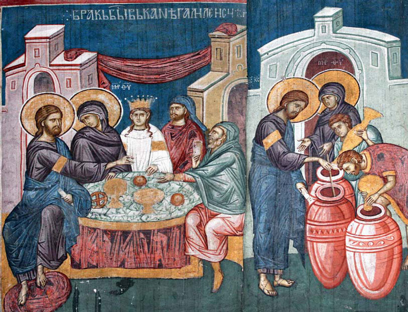 На третий день был брак в Кане Галилейской, и Матерь Иисуса была там. Был также зван Иисус и ученики Его на брак. И как недоставало вина, то Матерь Иисуса говорит Ему: вина нет у них. Иисус говорит Ей: что Мне и Тебе, Жено? еще не пришел час Мой. Матерь Его сказала служителям: что скажет Он вам, то сделайте. Было же тут шесть каменных водоносов, стоявших по обычаю очищения Иудейского, вмещавших по две или по три меры. Иисус говорит им: наполните сосуды водою. И наполнили их до верха. И говорит им: теперь почерпните и несите к распорядителю пира. И понесли. Когда же распорядитель отведал воды, сделавшейся вином, – а он не знал, откуда это вино, знали только служители, почерпавшие воду, – тогда распорядитель зовет жениха и говорит ему: всякий человек подает сперва хорошее вино, а когда напьются, тогда худшее; а ты хорошее вино сберег доселе. Так положил Иисус начало чудесам в Кане Галилейской и явил славу Свою; и уверовали в Него ученики Его (Ин. 2:1–11).