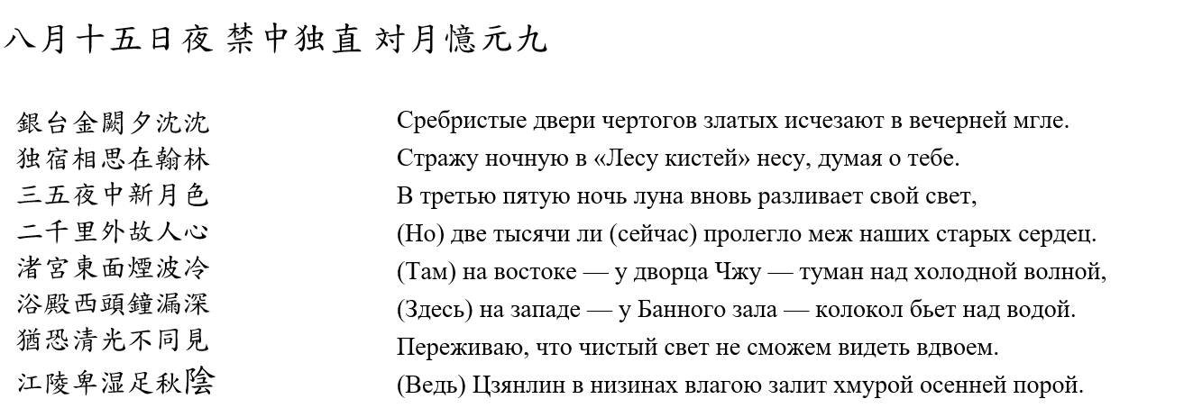 В завершение всего – надежда и опасение, надежда на то, что, даже находясь в разлуке, они могут вместе смотреть на одну и ту же луну и любоваться ее чистым, подобно воде, светом, а опасение в том, что Цзянлин расположен в низине и осенью в нем всегда сыро, промозгло и хмуро, поэтому луну за дождевыми облаками друг может и не увидеть.