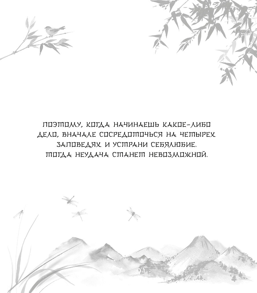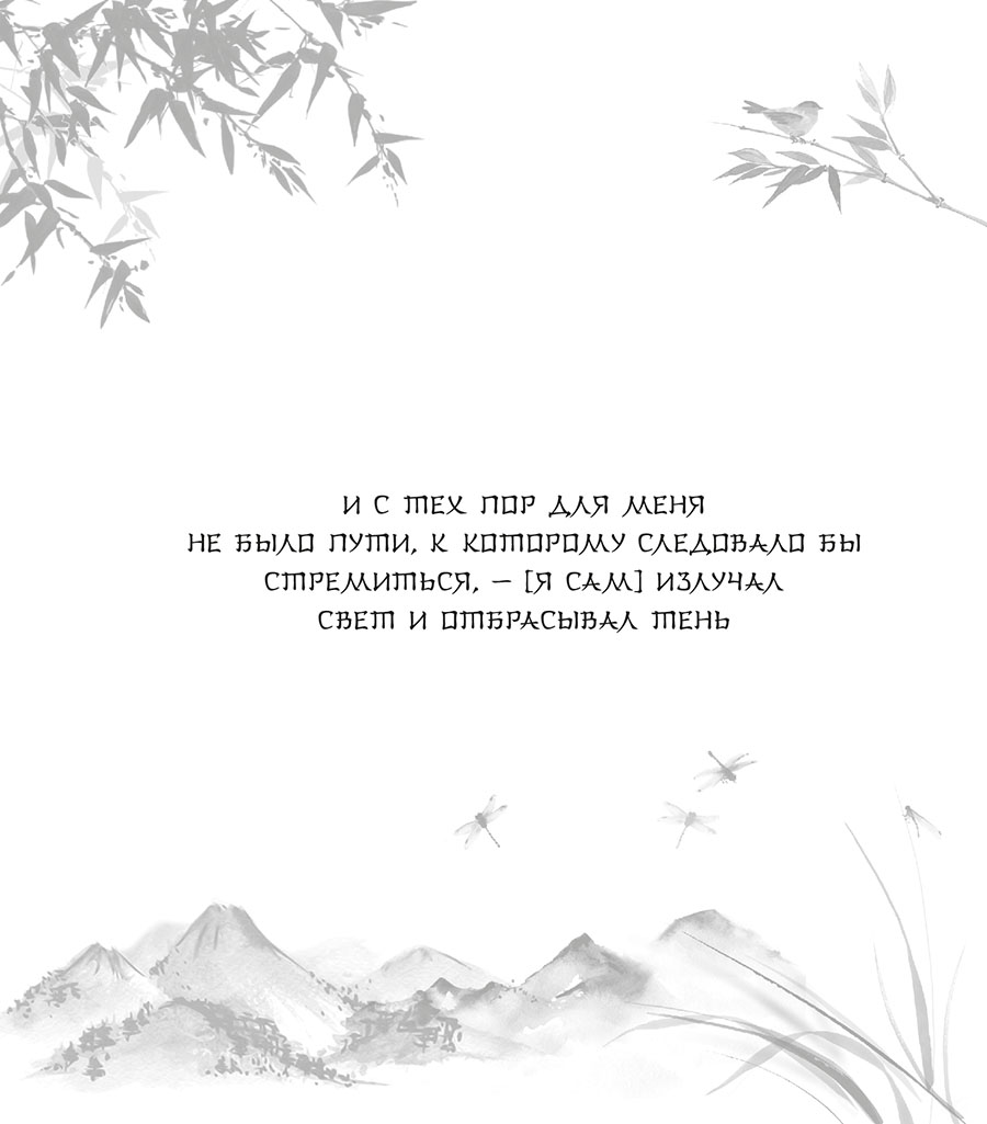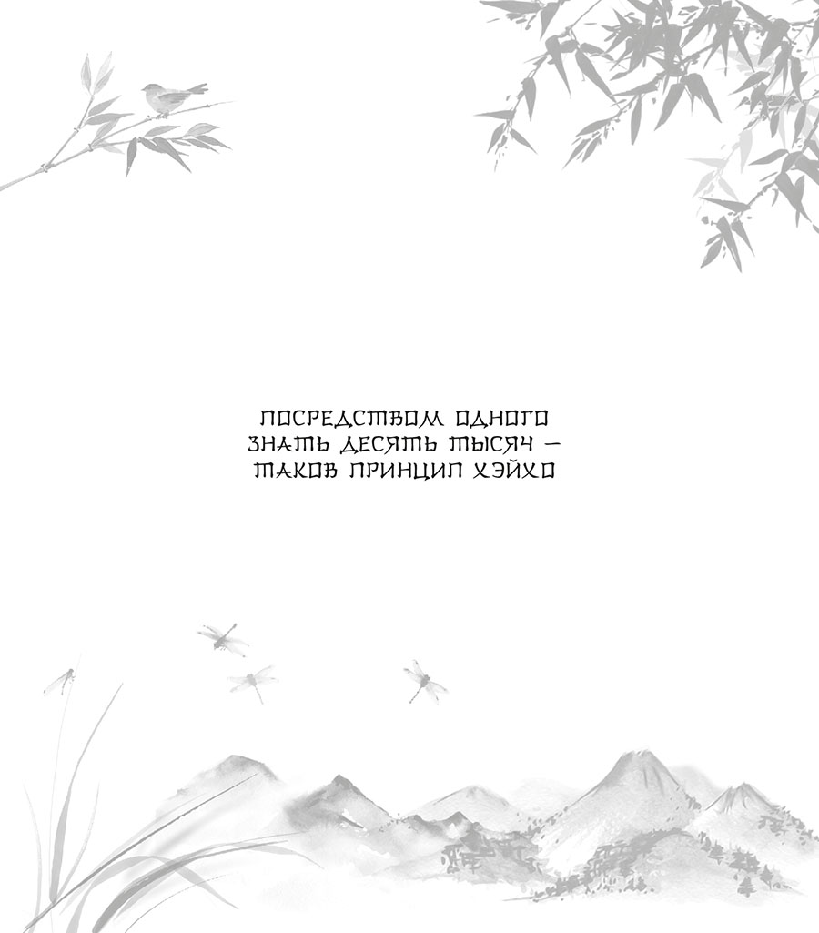 Когда мне перевалило за тридцать, я обернулся, посмотрел на прожитое и понял, что побеждал не оттого, что достиг высшего [мастерства] в хэйхо. Быть может, [это происходило] по той причине, что [я в достаточной мере] воспользовался способностями, [которые открываются на] этом Пути, или не отступал от Принципов Неба (Тэнри). А может, воины других школ не были достаточно [умелыми]? После этого я решил глубже постичь Принцип Пути (Дори), занимался днем и практиковал ночью, однако вышел на [истинный] Путь хэйхо лишь где-то в пятьдесят лет. И с тех пор для меня не было Пути, к которому следовало бы стремиться, – [я сам] излучал свет и отбрасывал тень. Положившись на основы хэйхо, я прилагал их ко всем искусствам и всем ремеслам и ни в каком деле не нуждался в учителях. Сейчас, составляя эту книгу, я не приводил слова ни из Закона Будды, ни из Пути Конфуция, не пользовался древними военными повествованиями и книгами по воинскому искусству; сделав заключение об одной школе, [я решил] полностью раскрыть сердце и, глядясь в зеркало Небесного Пути (Тэндо) и [богини] Кандзэон, в час Тигра ночью на десятый день десятого месяца я взялся за кисть и принялся писать.