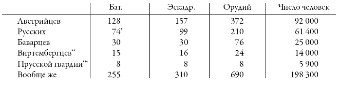 Австрийские легкие дивизии графа Бубны и принца Морица Лихтенштейна; австрийские же корпусы: 1-й, графа Коллоредо; 2-й, принца Людовика Лихтенштейна, и 3-й, графа Гиулая, всего в числе 54 388 человек с 224 орудиями.