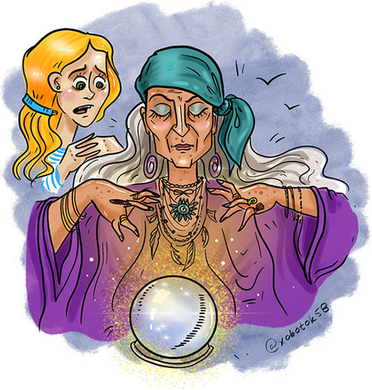 * * *Ведьма, пожилая женщина с длинными седыми волосами, глубоким декольте и, как говорят, «следами былой красоты» пригласила Раису войти. Краем глаза девушка отметила, что в квартире у ясновидицы сделан неплохой ремонт (черные обои с серебряными цветами, изысканная черная мебель, статуэтки неизвестных широкому зрителю богов и большой стол с возвышающимся на нем стеклянным шаром).