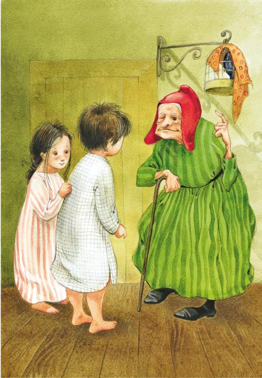 Перед ними стояла крохотная старушонка в зелёном платье и красном чепце. Ух и страшна она была! Горбатая, одноглазая, хромая, нос крючком. А голос какой хриплый и ворчливый!