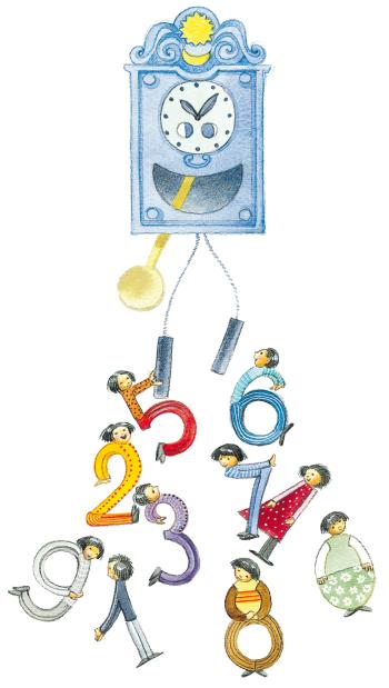 И фея протянула Тильтилю зелёную шапочку. Он надел её, осторожно повернул алмаз, и… И комната наполнилась звуками и голосами. Часы на стене заходили ходуном, циферблат расплылся в улыбке, и с него посыпались, поскакали на пол крохотные человечки, похожие на цифры. Они вихрем закружились в хороводе, напевая колокольчиковыми голосами: