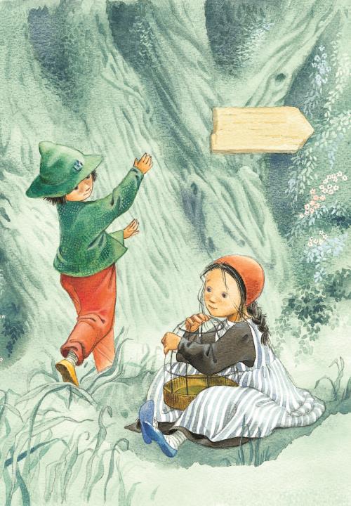 И впрямь туман стал разваливаться на куски, словно простокваша. В промежутках проглядывали деревья, кусты, каменистая дорога. Вдруг прямо перед детьми вырос громадный дуб. Они стояли у его подножия, а тяжёлые густые ветви заслоняли всё вокруг. Тильтиль приподнялся на цыпочки и разглядел прибитую к стволу дуба дощечку. На ней было написано: СТРАНА ВОСПОМИНАНИЙ. И стрелка указывала дорогу.