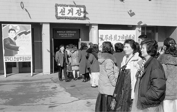 Одним прекрасным весенним днем я отправляюсь в избирательный округ номер 17 в центре Пхеньяна с журналистом Бентом и фотографом Полом с норвежского телеканала TV2, для которых мы с Мистером Вином выбили право въезда в страну. Мы устанавливаем камеру у входа в избирательный участок, где граждане в своих лучших воскресных костюмах выстроились в очередь под большим красочным плакатом: