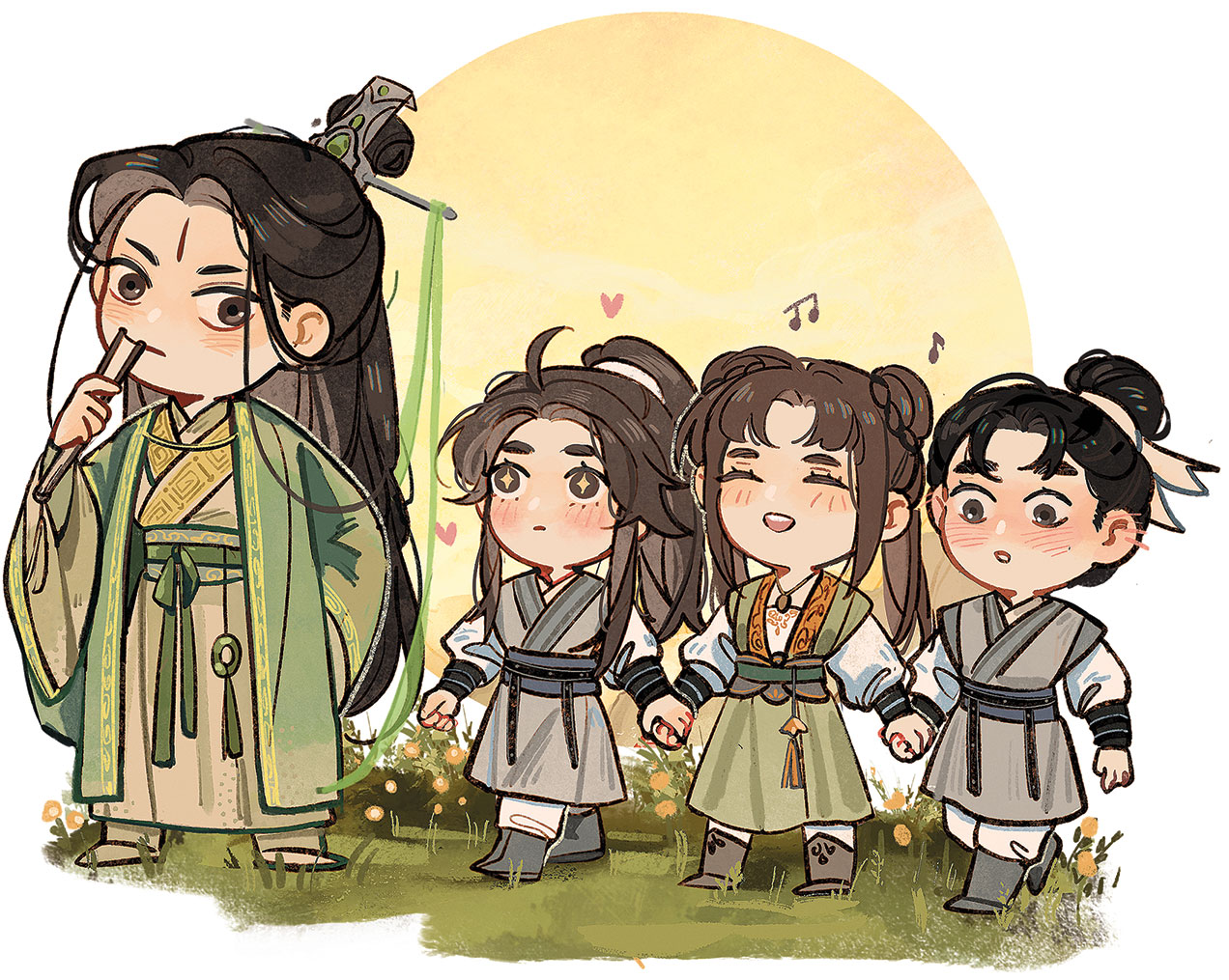 Открыв глаза, Шэнь Цинцю обнаружил, что Ло Бинхэ его рассматривает, – в эту минуту во взгляде мальчика проглядывала его будущая натура: «Глаза – словно две ледяные звезды, зубы блестят в лёгкой улыбке, с губ слетает тихая непринуждённая шутка».
