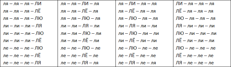 ЛЯ – ле – ле ЛЕ – ли – ли ЛЁ – лю – лю ЛИ – лё – лё