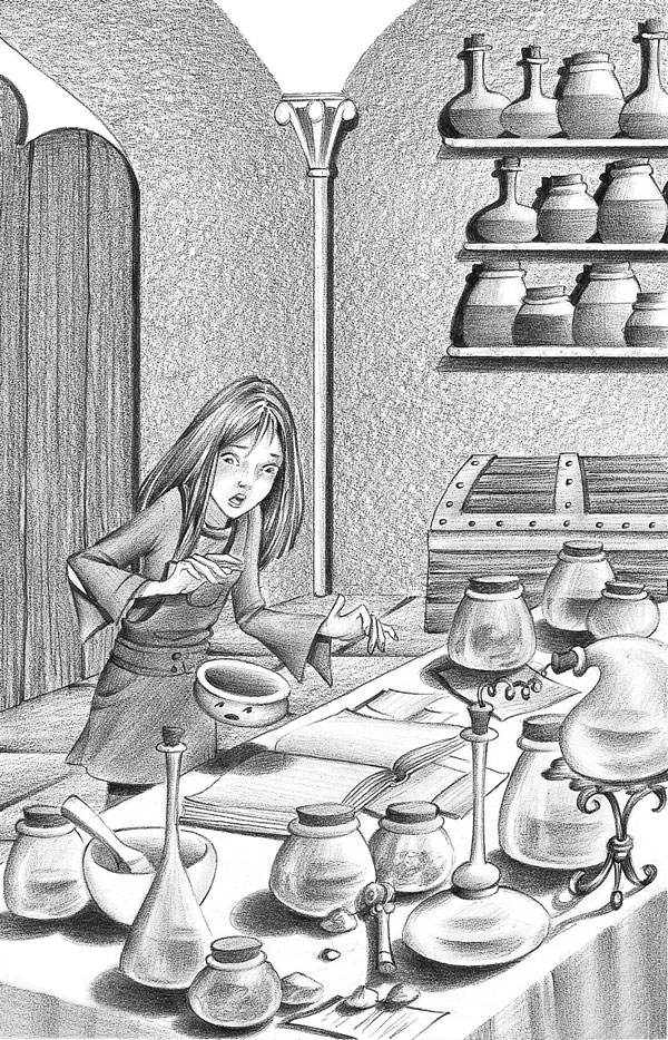 Сосуд с Пылью Светящейся счастливо похрапывал в уголке, баночка с Накипью Желтой с любопытством разглядывала мешочки с драгоценными камнями. Увидев входящую девочку, пугливая мисочка с Солью Морской юркнула за каминчик.