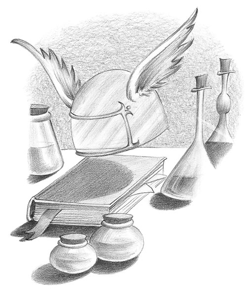 Девочка перебрала сосуды на полках лаборатории, взяла на одной желтую фарфоровую чашку с почвой Ксоракса, а на другой – тоненькую бутылочку с Ртутью Чистой. Положила оба вещества в тигель, где кипела смесь из сапфира и золота. Посмотрела на часы и, помешивая, выждала десять минут. Пламя каминчика опало, и из тигля вылетели два желтых крыла, несущие прозрачный шлем. Девочка протянула было руку, чтобы взять его, но крылья отнесли шлем к книге «Долус». Повиснув над книгой, шлем втянул ее в себя, и, словно по волшебству, на лабораторный стол спланировало уже пять шлемов. После чего желтые крылья вернулись в тигель, а пламя каминчика вновь ярко вспыхнуло.
