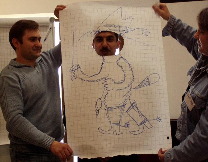 Работают две, или более команды. Они изображают на листе флипчарта некий широко известный персонаж (мультипликационный, сказочный) и предлагают одному из участников другой команды с помощью исключительно открытых вопросов (закрытые вопросы штрафуются) понять, кто же он? Как видно на фото, сам испытуемый не видит изображение. Упражнение имеет ряд особенностей, позволяющих несколько отрезвить участников, декларирующий умение задавать открытые вопросы. Оказавшись на виду всей группы в условиях ограничения по времени, далеко не каждый справляется с заданием в условленные 2 минуты…