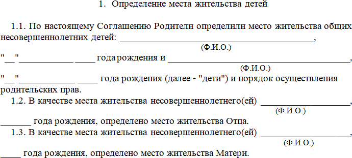 1. Предмет соглашения1.1. По настоящему Соглашению Родители договорились на основании ст. 65 Семейного кодекса Российской Федерации определить место жительства общего несовершеннолетнего ребенка ______ _______года рождения с Матерью/Отцом ____________.