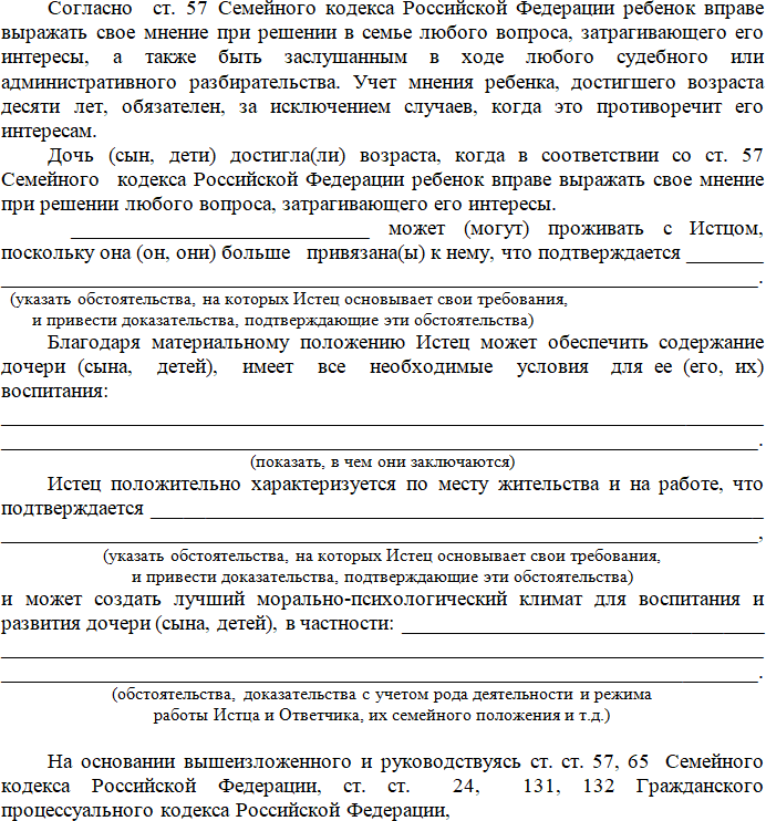 Проживание с Истцом более соответствует интересам ребенка (детей), поскольку _______________________________________________________ (доводы в пользу совместного проживания Истца с ребенком / детьми. Например, привязанность ребенка к данному родителю, братьям, сестрам; возраст ребенка; нравственные и иные личные качества родителей; отношения, существующие между каждым из родителей и ребенком; возможности (или их отсутствие) каждого из родителей по созданию ребенку благоприятных условий для воспитания и развития (род деятельности, режим работы, материальное и семейное положение родителей); близость к дому детского учебного/дошкольного учреждения и др.).