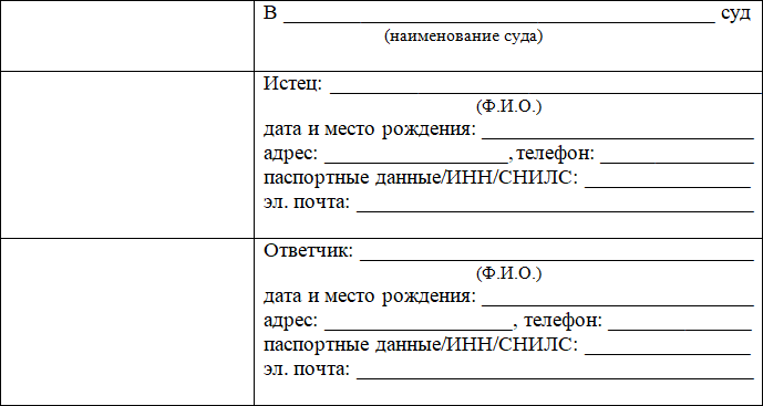 • сведения об истце: фамилию, имя, отчество, дату и место рождения, место жительства и один из идентификаторов (СНИЛС, ИНН, паспорт), а по желанию – контактный телефон и адрес электронной почты;