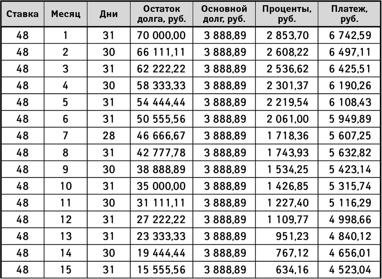 Итого у нас ушло 8 + 3 + 1 = 12 месяцев и 82 500 + 31 360 + 12 184 = 126 044 руб. Не забудем про процентные платежи 552 + 898 = 1450 руб. По сравнению с положенными 143 785 руб. экономия (143 785–126 044 – 1450) составила 16 291 руб.