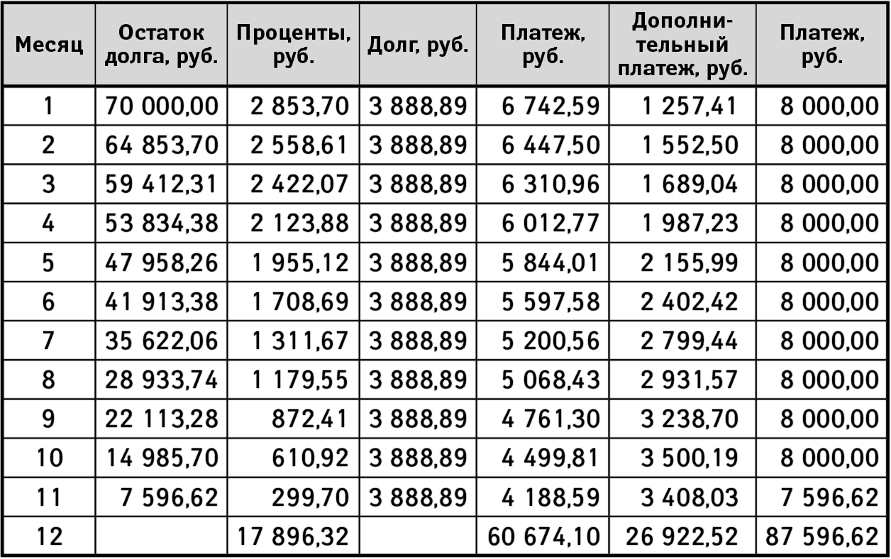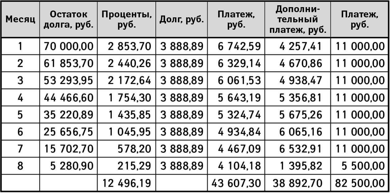 Получается, что при ежемесячных платежах в 11 000 руб. кредит на 70 000 руб. гасится за 8 месяцев вместо 18 месяцев. Вместо 96 629,41 руб. вы платите 82 500,00 руб. Все 8 месяцев платим 898 руб. по процентам за два других кредита. Это 7184 руб.