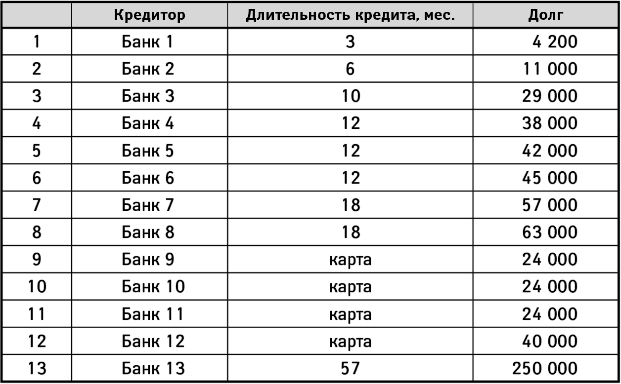 Основная масса кредитов была набрана для погашения предыдущих. Так как у нее был жуткий страх перед судом и приставами, и, учитывая ее зарплату в 12 000 рублей, ей пришлось создать следующий план выхода из долгов в досудебном порядке.