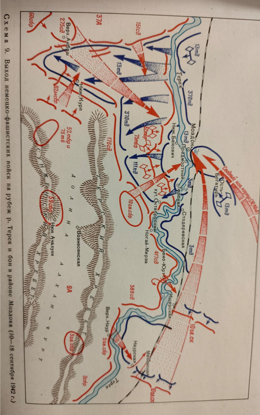 Так, на рассвете 30 августа по Мундар-Юртом немцы предприняли попытку форсировать Терек. Сообщение об этой попытке было тотчас же отправлено в штаб командующего Северной группы генерал-лейтенанту И. И. Масленникову и командующему 9-й Армией генералу К. А. Коротееву. Естественно, у них вопрос: «Что это? Разведка боем или больше?» И почему здесь, а сосредоточено две танковые и две пехотные дивизии? Именно там немцы намечали форсировать Терек. Однако почему они предприняли эту попытку у Мундар-Юрта? Здесь, на пути к Грозному, им надо преодолеть Терский хребет. Для танков это не лучший путь. А без них они не пойдут. Следовательно, под Мундар-Юртом это только отвлекающий удар. Хотят заставить нас распылить силы, оголить фронт под Моздоком.