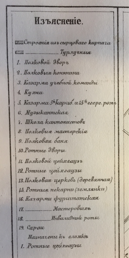 Стр. 276. Опись строениям в крепости Грозной состоящим. 1. Дом деревянный в столбах забрат пластинами с вновь пристроенными четырьмя комнатами с дощатыми полами и потолками покрытыми камышом. Дом занят начальником левого фланга Кавказской линии. В хорошем виде. 2. Кухня с кладовой в столбы забраты турлуком с дощатым потолком крытая землею. Дом занят прислугою начальника левого фланга. Ветхая и никуда негодная. 3. Флигель о четырех комнатах из них две турлучныя, а две из камня земляного кирпича крытыя камышом. Дом занят чиновниками и служителями начальника левого фланга. Комнаты из композиционного кирпича в хорошем виде, а турлучные весьма ветхие. 4. Дом в столбах забратый турлучным с деревянными полами и потолками покрыты камышом. Дом занят обер-офицерами Куринского егерского полка. Очень ветхий и занимается только по необходимости. 5. К дому этому турлучная кухня. Дом занят прислугою. Очень ветхая и занимается по необходимости. 6. Флигель покрытый землею с деревянным полом и потолком. Дом занят обер-офицерами Куринского егерского полка. Очень ветхий и никуда негодный. 7. Дом деревянный с дощатыми полами и потолками покрыт камышом. К дому этому отдельная кухня из композиционного кирпича. Дом занят штаб хором Куринского егерского полка. В хорошем виде. 8. Флигель в столбах забрат турлуком с дощатыми полами и потолками покрыт камышом. Занят Обер-офицерами Куринского егерского полка. Весьма ветхий и занимается по необходимости. 9. Казарма в столбах забратая турлуком и к оной связи пристроен рубленой из бревен каземат в котором пол и потолок дощатые. Занят нижними чинами 12 горнизонной артиллерийской бригады, а каземат арестантами. Ветхий и занимается только по необходимости. 10. Казарма забратая в столбах пластинами с деревянными потолками и нарами покрыта камышом. Занят 3 линейною ротой Кавказского линейного №12 батальона. Очень ветхая и держится только на одних подпорах. 11. Пороховой погреб в крепостной канаве три стены оного в земле, а четвертая из пластин. Занят артиллерийскими снарядами. Очень ветхий и занимается только по необходимости. 12. В крепостной канаве Цейхгауз в столбах забратый турлуками покрыт землею. Занят артиллерийскими снарядами. Очень ветхий и занимается только по необходимости. 13. Флигель из композиционного кирпича с деревянными полами и потолками покрытый камышом. Занят кантонистами Куринского егерского полка. В хорошем виде. 14. Флигель турлучный забратый в столбы с дощатыми полами и потолками покрытый землею. Занят Канцелярией начальника левого фланга. Ветхий и никуда негодный. 15. Офицерский флигель в столбах забрат турлуком с дощатыми полами и потолками покрыт землею. Занят комиссией военного суда при Куринском егерском полку учреждаемой офицерами Куринского полка. Ветхий и никуда негодный. 16. Офицерский флигель в столбах забрат турлуком с дощатыми полами и потолками покрыт камышом. Занят обер-офицерами Куринского полка. По ветхости никуда негодный. 17. Офицерский флигель в столбах забрат турлуком с дощатыми полами и потолками покрыт камышом. Занят обер-офицерами Куринского полка. По ветхости никуда негодный. 18. Штаб офицерский дом забратый в столбы турлуком с дощатыми полами и потолками покрыт камышом. Занят штаб-офицерами Куринского полка. По ветхости никуда негодный. 19. К этому дому отдельная кухня в ст