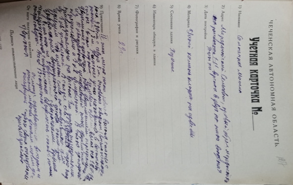 Долина р. Акки-хи, близ с. Амки. Башня красивой архитектуры, известная под именем Мозыр-Юрт, расположена на высоком скалистом утесе у входа в ущелье у устья бокового оврага. На противоположной стороне оврага – развалины башен, меньших размеров. Несколько ниже башни, ближе к берегу речки находится четырехугольный продолговатый склеп с глубокими нишами на наружных стенах.