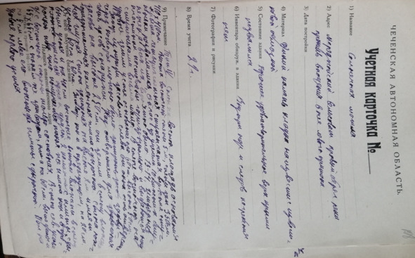 Ичкерия или Нагорная Чечня. Ичкерией называется южная и юго-восточная часть Чечни, простирающаяся от подошвы Чеченских Черных гор до Кавказского хребта, носящего название Андийского и служащего границей между Чечней и Дагестаном. На востоке Ичкерия граничит с территорией Салитанского Общества, Дагестанского племени, а на западе примыкает к другой части нагорной Чечни, занимающей бассейн р. Аргуна. Территория Ичкерии невелика и занимает не более 1200 или 1300 кв. верст. В долинах и ущельях Ичкерии древних могильников довольно много. Чаще всего могильники эти находятся вблизи аулов, не более или менее отлогих скатах гор; но бывали примеры, что отдельные могильники встречались и на вершинах высоких гор, под тенью столетних деревьев. Характер могильников общий для всех могильников нагорной полосы: на поверхностях заметны следы плит, или расположенных в горизонтальном положении или в вертикальном; по снятии дерна и расчистки места оказывается каменный ящик, длиной до полтора метра и шириной от 25 см. до 80 см., прикрытый плитами или без них. Расположение могил почти всегда имеет направление с севера на юг. Могильный инвентарь не богат, напоминает предметы, находимые в Чечне и принадледжат также ко времени не более древнему как XII век.