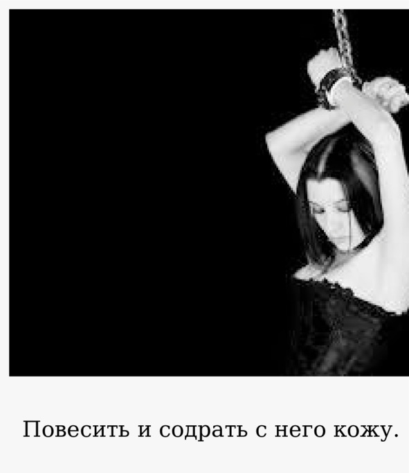 Достаньте ее из ящика, а она еле стоит, перегоните немного денег, и скормите ее маленькому кусочку картофельного пюре, а потом подвесьте их веревками от новых и выпорите ее кнутом, замучите ее за прежнее, а когда он закончит опустошать внутри больную голову, на ее теле ослабят веревки, потом верните ее в гроб, как живую дичь, к лотку у левого купола.