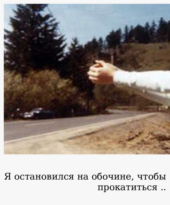Как будто та девушка ушла из нашего дома, и она не несет с собой только небольшую сумку с какой-то одеждой и спальную сумку. Я стоял на обочине дороги, внешней от окраины города, за медитирующими транспортными средствами и без запаха, и поток в пищевом колодце, используя пульс ее сердца и завися от вакуума по сообразительности, чтобы быть жестким с ним, и вы должны избегать его, был подтвержден догадкой, что он дважды, один раз с водителем грузовика, старый отвезет его на половину расстояния и купит ему ужин за его счет, а другой с женщиной, путешествующей в одиночку в пикапе, сократит ее на четверть расстояния до цели, уже не отделенной от цели всего менее чем сотней миль. Не было теперь надобности только подвезти только одну и у дверей ее подругу. Я снова стоял на краю дороги, наблюдая за проезжающими машинами и размышляя о еде, и не спрашивал времени, пока не остановится не водитель большого грузовика, но она отказалась садиться, не поднялась за водителем, потом остановилась, не элегантный мужчина за рулем современного автомобиля, но она тоже отказалась подниматься, не понравилась его внешность, она упала инновационная. Наконец остановилась ее маршрутка-микроавтобус, – говорит молодой человек с тихими чертами лица, а рядом с ним сидит красивая молодая женщина с ребенком на руках, не стесняясь, чтобы Колин на этот раз, конечно, не был мужчиной с женщиной и ребенком, чтобы причинить ей боль.