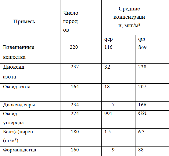 Средние за год (qср) и средние из максимальных концентрации (qм) основных загрязняющих веществ, по объему выбросов в атмосферу являются бенз(а)пирен и формальдегид, полученные по данным регулярных наблюдений в 2017 г. в городах Российской Федерации, представлены в таблице № 1.