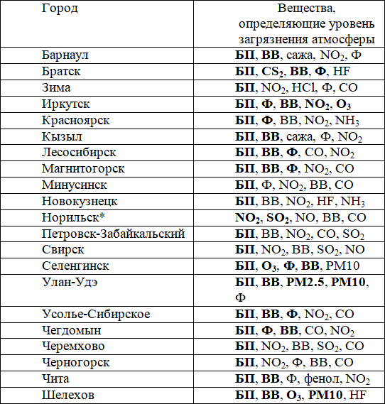 Города с наибольшим уровнем загрязнения атмосферы и вещества, его определяющие, согласно (Постановление Правительства РФ от 28.09.2015 № 1029 «Об утверждении критериев отнесения объектов, оказывающих негативное воздействие на окружающую среду, к объектам I, II, III и IV категорий) в 2017 г. следующие – Братск – БП, CS2, ВВ, Ф, HF; Красноярск – БП, Ф, ВВ, NO2, NH3; Магнитогорск – БП, ВВ, Ф, NO2, CO; Новокузнецк – БП, ВВ, NO2, HF, NH3; Норильск – NO2, SO2, NO, ВВ, СО; Чита – БП, ВВ, Ф, фенол, NO2, где: БП – бенз(а)пирен, ВВ – взвешенные вещества, PM – взвешенные частицы фракций PM10 и PM2.5, Ф – формальдегид, CO – оксид углерода, CS2 – сероуглерод, HCl – хлорид водорода, HF – фторид водорода, NH3 – аммиак, NO2 – диоксид азота, NO – оксид азота, О3 – приземный озон, SO2 – диоксид серы.